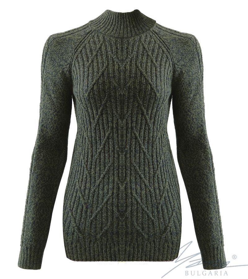 The woolen women's sweaters of "YANA" Ltd. with high polo neck in structural knit Arani with long raglan sleeves knitted in 5 fine are extremely convenient and comfortable to use, thanks to the best knitting world practices. The highest production standards for woolen fabrics. The most environmentally friendly finish thanks to the Swiss company THIES GmbH. The sweater has a stylish regular cut, in line with the latest fashion trends, fully fashion knitted, without cutting. The latest colors for the season. It is Ideal for both the office and leisure. Weight: 390 grams.